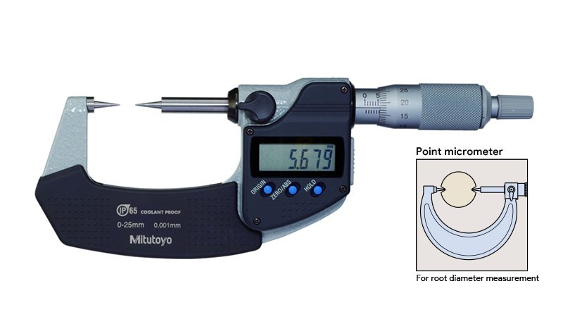 ไมโครมิเตอร์ดิจิตอลประเภท Screw Thread Micrometers ที่มีปลายสับผัสที่ออกแบบมา เพื่อใช้ในการวัดเส้นผ่านศูนย์กลางของชิ้นงานประเภทต๊าปรีมเมอร์ดอกกัด เฟืองเดือยและเฟืองเกลียวทรงกลมเพื่อหาความหนาและระยะของชิ้นงานสามารถเปลี่ยนหัวได้หลายระดับและชิ้นงานทั่วไปเลือกใช้ตามความเหมาะสม