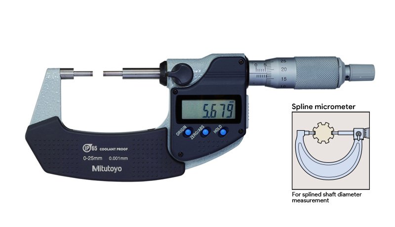 ไมโครมิเตอร์ดิจิตอลประเภท Spline Micrometers ที่มีปลายสับผัสที่เล็กเหมะกับงานประเภทวัดร่องของชิ้นงานที่ขนาด 3 mm สำหรับวัดเพลาประกบสล็อตและรูกุจแจและชิ้นงานทั่วไปเลือกใช้ตามความเหมาะสม
