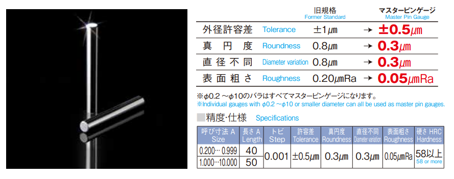 Master Pin Gauge ของยีห้อ Eisen จะมีค่าความคาดเคลื่อนที่และค่าความกลม ค่าความหยาบผิวที่ดีกว่ารุ่นปกติ ทำให้พินเกจของไอเซ็นใช้ในการวัดงานที่ละเอียดมากขึ้น นอกจากนี้แล้ว Master พินเกจของ Eisen จะได้รับการสอบเทียบโดยใช้เครื่อง Laser-Scan Micrometer ทุกตัวและค่าจริงจะถูกตีเลเซอร์ไว้ที่กล่องพินเกจ ทำให้ผู้ใช้งานมั่นใจกับพินเกจของ Eisen มากขึ้น นอกจากนี้แล้วทางโรงงาน EISEN เป็นเจ้าเดียวในญี่ปุ่นที่ผลิตพินเกจภายใต้มาตรฐาน ISO17025 ( หากทางลูกค้าสนใจ สามารถติดต่อมาขอเอกสารได้)