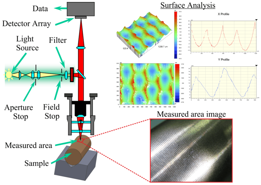 Confocal Microscopy เหมาะสำหรับพื้นผิวหยาบ พื้นผิวที่มีมุมชัน หรือโครงสร้างซับซ้อน สามารถสร้างภาพพื้นผิวแบบ 3 มิติได้อย่างละเอียด เก็บข้อมูลพื้นผิวได้ครบถ้วน แม้ในบริเวณที่เข้าถึงยาก