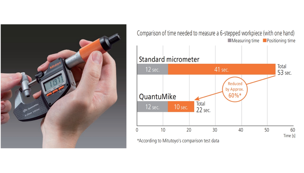 ด้วยสปินเดิลพิทช์ 2 มม. ทำให้สามารถหมุนเข้าใกล้ชิ้นงานได้รวดเร็วกว่าไมโครมิเตอร์ทั่วไป ช่วยลดเวลาในการวัดในแต่ละชิ้นงานอย่างชัดเจน