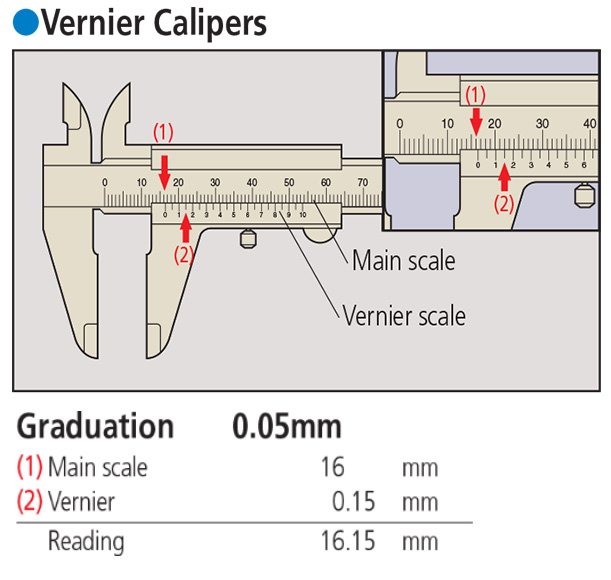 (1) คือ สเกลหลักเวอร์เนียร์ที่เราอ่านค่าแบบหยาบ 16 mm ตรงกับเส้น 0 ของสเกลรองมากที่สุด